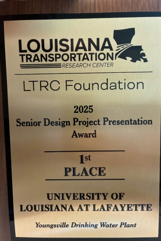 Senior Design Project Presentation Award presented by the LouisianaTransportation Research Center (LTRC) Foundation.The award recognized the students’ outstanding presentation and design work for their Youngsville Drinking Water Plant project. The senior design project challenged students to apply engineering principles, technical analysis, and practical design considerations to develop a comprehensive solution addressing real-world infrastructure needs.